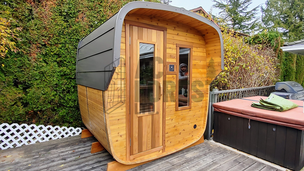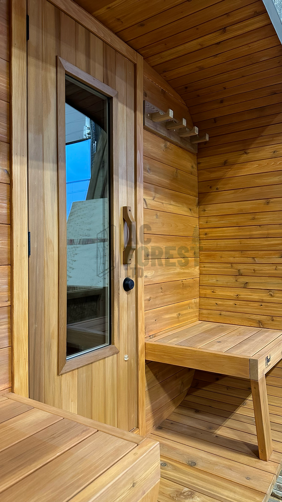 8FT long Western Red Cedar square barrel sauna with rounded corners and curved walls. Features: