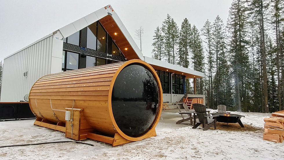 Custom 10FT long x 7FT diameter cedar barrel sauna, fits up to 6 people. Custom made 7.5FT sauna room and 2.5FT porch. Our unique project built in the wilderness of Chilliwack mountains, featuring: